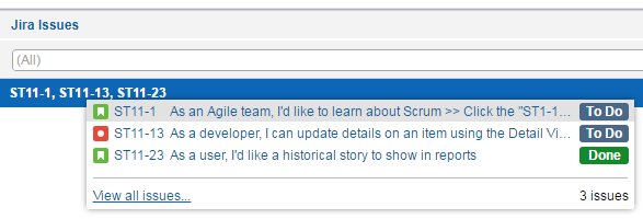 A list of attached issues opens. The issue ID, summary, and status are displayed.