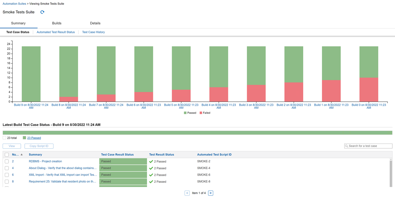 In an automation suite, you can view status information for recent builds from a test case perspective. This can help you see how many test cases associated with test results in the build passed, failed, or have another status.