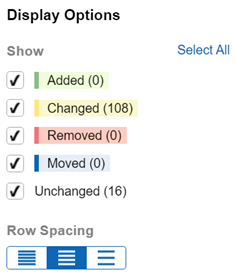 - Show — Select the differences to display in the list. Click Select All to select all differences. If multiple differences types are selected, but you only want to display one type, mouse over the type to display and click