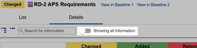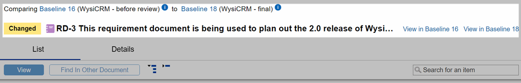 to collapse it. You can also search for items in the document. Matches are displayed as you type.- To view differences for a specific requirements, click the summary or select the requirement and click View. The requirement differences are displayed. See Viewing differences between items in baselines for information about requirement differences.