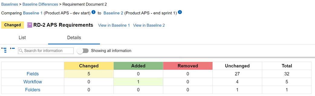 When you are comparing two baselines, you can view differences for a specific requirement document in the baselines. You can see detailed changes made between the baselines, such as changes to fields, workflow, links, folders, and more.