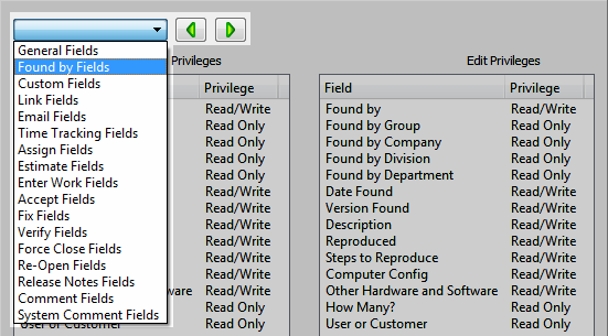 • By default, users in new groups can view or edit every field. Select a field category from the list to view fields or click the Previous button and the Next button to move between categories. Make sure to set Add and Edit privileges for all field categories.