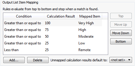To generate a list value output, a set of conditions are configured to map the calculation result to a list item. The conditions run top to bottom until the result matches a mapped list value, which is the field's generated output.