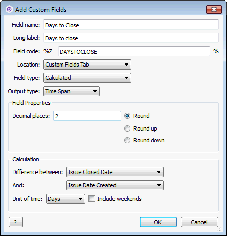 The following example shows the configuration for a calculated field that returns the number of days to close an issue after it was created.