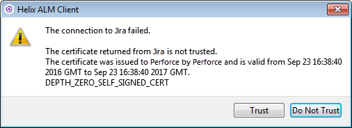 - If errors persist after clicking Trust or if you click Do Not Trust, you must make changes before ALM can connect to Jira. See the knowledge base for information.
