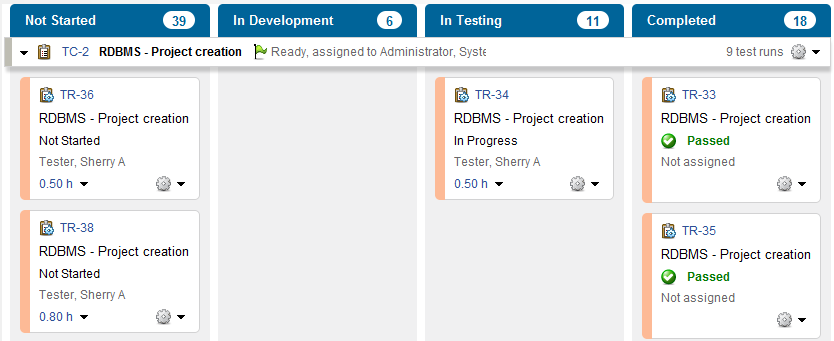 A column can contain different item types in different workflow states. For example, a task board may have Not Started, In Development, In Testing, and Complete columns. The Not Started column may contain issues in the New state, requirements and test cases in Draft states, and manual test runs in the Not Started state.