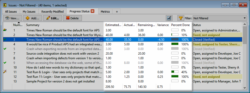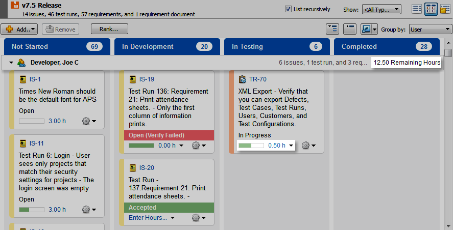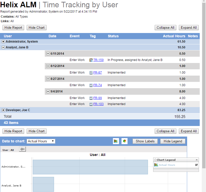 There are several areas in Perforce ALM where you can view time tracking data. Following are some of the common areas to view this data. The examples show the desktop client, but you can also view data in the same areas in the web client.