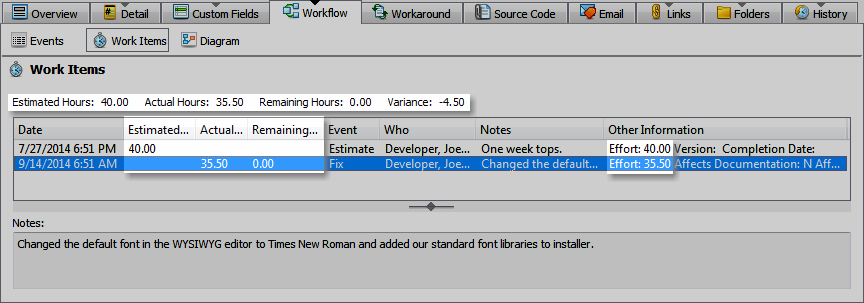 This tab displays events with time tracking fields that were entered for a specific item. The estimated, actual, and remaining work for an item, and the variance between the estimated and actual hours, is displayed. See Viewing work item history.