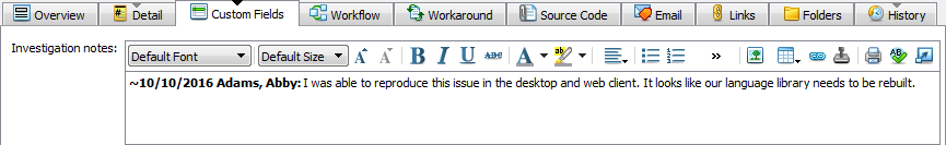Accepts multiple lines of text and other content. You can change the text formatting in these fields and insert images, tables, hyperlinks, and stamps. See Working with text fields.
