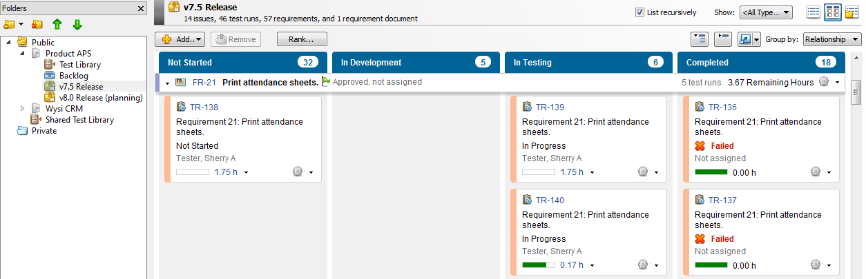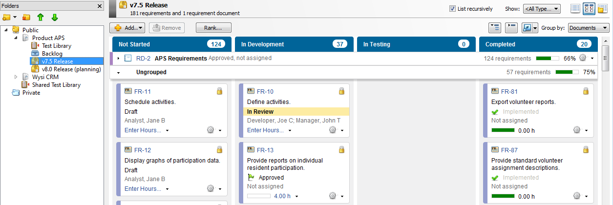 In the following example, the v7.5 Release folder is selected. The folder contains one document, APS Requirements, which is used as a swimlane. The swimlane contains all requirements in this document even if they are not in the folder. All requirements in the folder and any other items in the folder are displayed in the Ungrouped swimlane. If requirements are both in the folder and in a document in the folder, duplicate cards are displayed in the task board: in the document swimlane and in the Ungrouped swimlane.