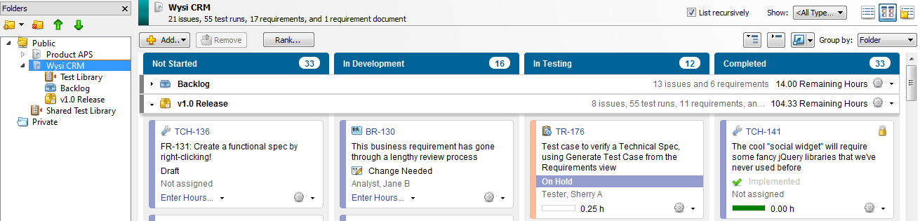 In the following example, the Wysi CRM folder is selected. Because items are displayed recursively, the task board has two swimlanes for subfolders in the Wysi CRM folder that contain items: Backlog and v1.0 Release. There is no swimlane for the Test Library folder because the task board is not configured to show swimlanes for empty folders. The Remaining Hours rollup field is displayed on the swimlane to indicate how many hours remain until all items in the swimlane are complete.