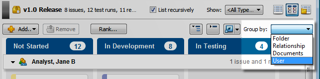 You can group items by folder, user, relationship, or requirement document depending on the task board configuration.