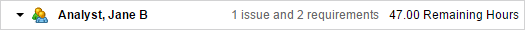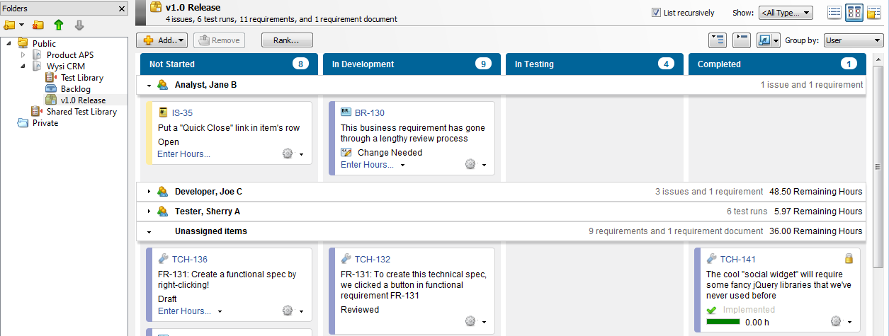 In the following example, the v1.0 Release folder is selected. Swimlanes are displayed for each user that has at least one item in the folder assigned to them. Unassigned items in the folder are displayed in the Unassigned items swimlane. The Remaining Hours rollup field is displayed on the swimlane to indicate how many hours remain until the user completes all items in the swimlane.