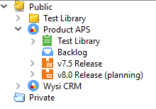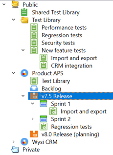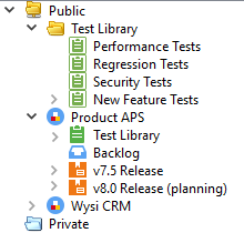 In the following example, there is a Test Library folder, which is for storing tests that may be used to test multiple products. There is also a Test Library test case suite folder in the Product APS folder, which is for storing tests specifically for Product APS.