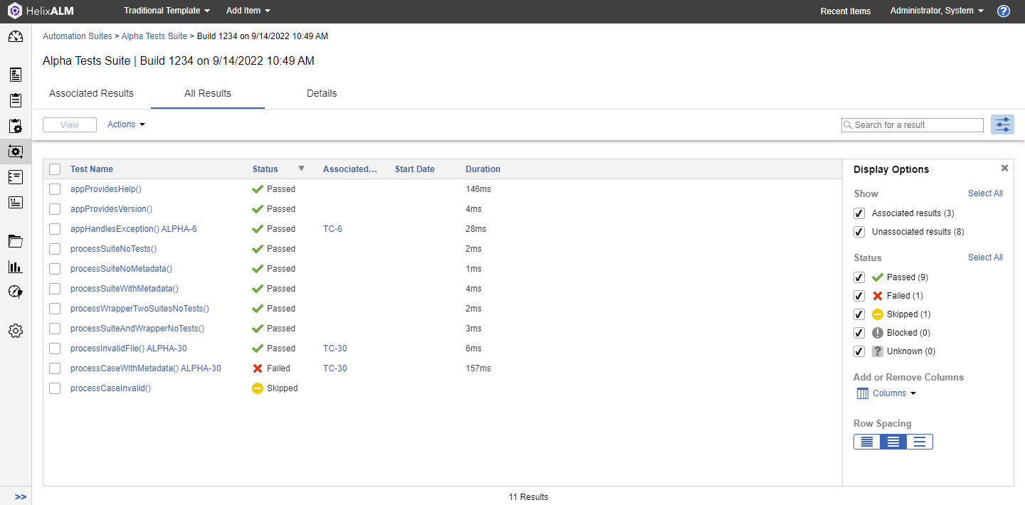 When viewing the results in the build, the All Results tab shows all tests that were included in the submitted build. The test result status, associated test cases, and duration are displayed.