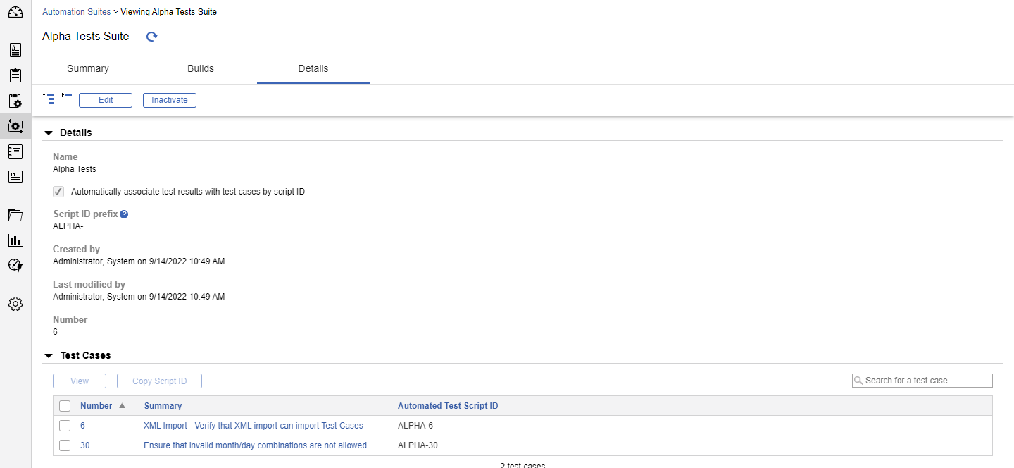 The suite is configured to automatically associate test results with test cases by script ID. The Test Cases area shows the automated test script IDs for the two test cases related to the tests that will run for this suite. During the test, these IDs are written out to the name attribute in the <testcase> element in the JUnit report files, as you can see in report file examples.
