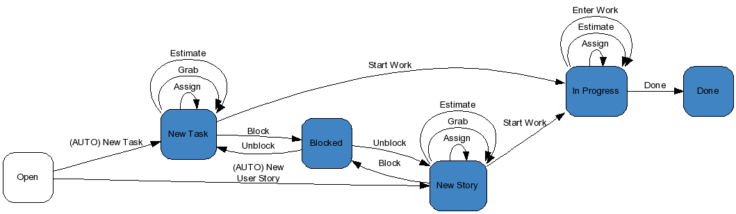 If your team has a workflow with a ‘branching’ state that is only used to route an item to a different state, consider leaving that state out of your task board column mappings. In the following example from the Scrum Template sample project, new items are moved automatically from the Open state to either the New Task or New Story state based on automation rules and requirement types. Items are only briefly in the Open state, so omitting that state from the task board simplifies the configuration and helps to avoid user confusion if the task board configuration is updated.