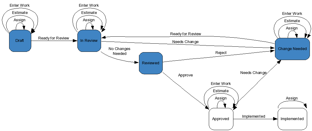 To make it easier to review which workflow states have been mapped or not mapped to columns, use the Diagram Workflow option in the Configure Workflow dialog box to show a color-coded workflow diagram for each of your item types. States in blue are currently mapped to a column and states in white are not mapped.