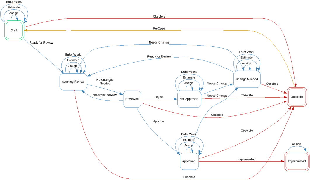 | Change Needed | During the review process, the requirement can move between this state and Reviewed until it is ready for approval. |