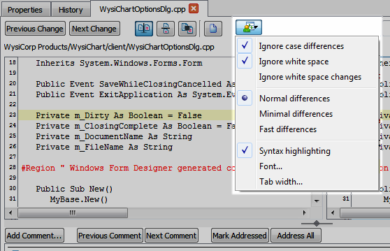 Tip: You can change the default settings for diffing file versions in code reviews in user options. See Configuring diff/merge application settings. You can also change the default settings for syntax highlighting, font, and tab width. Keep in mind that changes to these user options also apply to viewing and editing files in other areas of Surround SCM. See Changing file viewer and editor text display options.