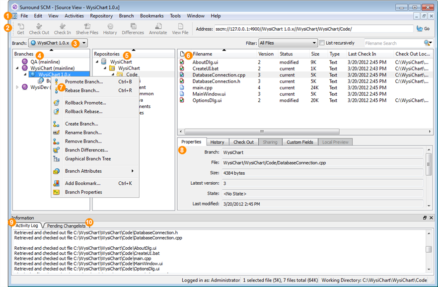 Branches tree | View available branches in a tree hierarchy. Many users hide the Branches tree and use the Branch menu to access branches. To hide the Branches tree, choose View and clear the Branch Tree option. Icons indicate branch type and status. See Branch status icons. |