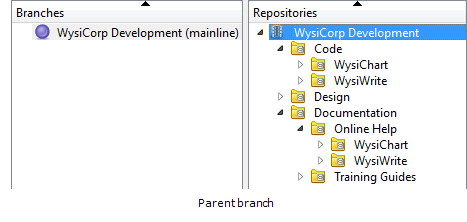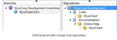 If multiple repositories at the same hierarchy level are included, a virtual root repository is created as a placeholder to show the path to the shared parent repository for all repositories included in the branch. For example, if the Code and Documentation subrepositories are included in the template for a branch created from the WysiCorp Development mainline branch, the repositories are added as subrepositories under the WysiCorp Development virtual root repository in the child branch.