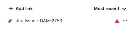 When viewing an asset with related Jira links, no additional information about the Jira work item is displayed and a warning icon is displayed next to the link. Point to the icon to view more information.
