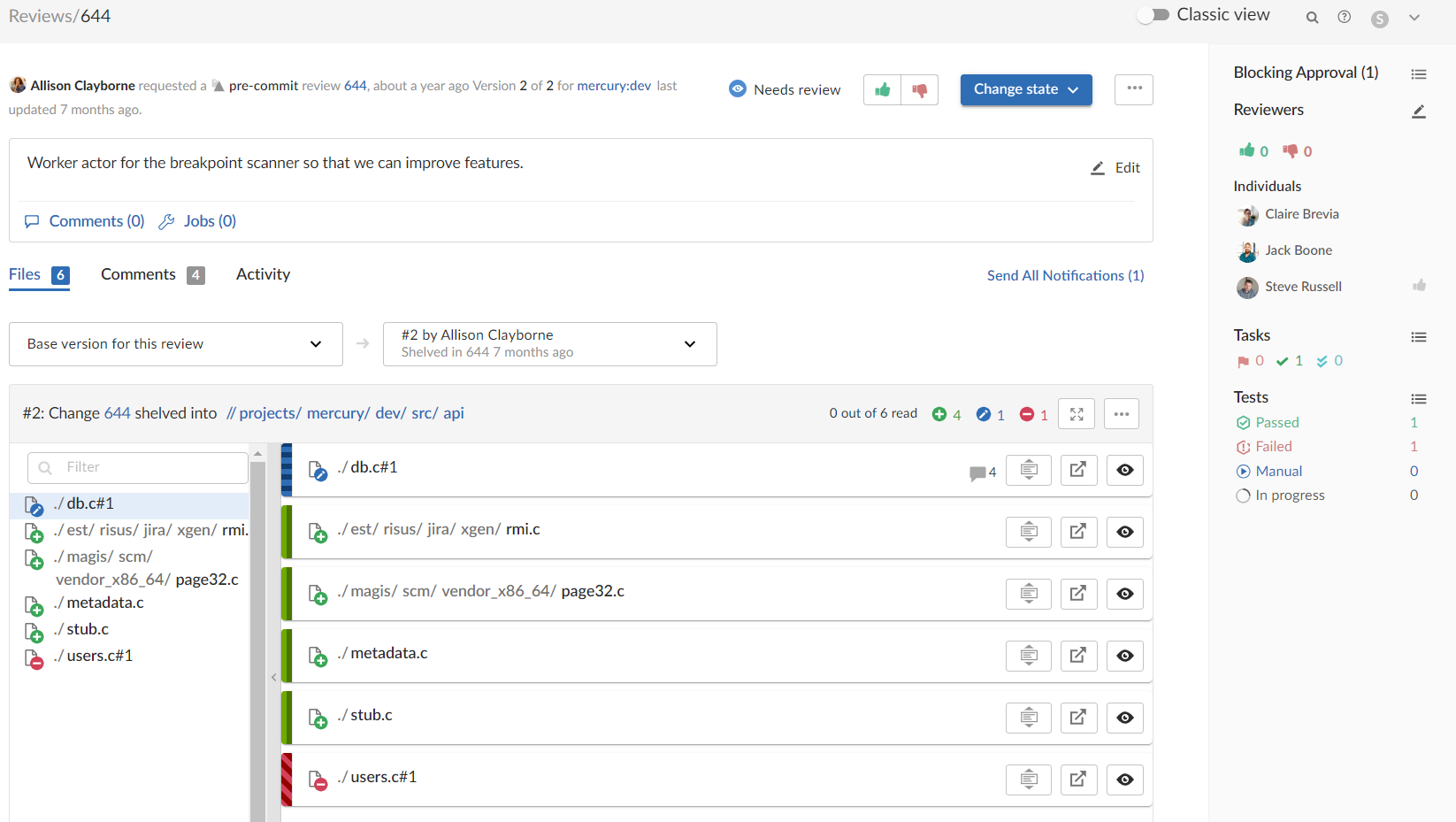 - Tests (if configured): displays the test results for the current review version in the information panel