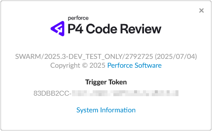 Click About P4 Code Review. The About P4 Code Review dialog box is displayed, and P4 Code Review generates an API token if it doesn't already exist.