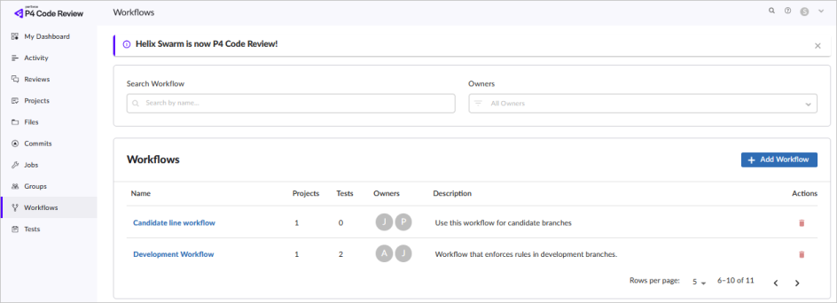 Workflows can be created by any P4 Code Review user, and they can be associated with projects or individual project branches. Once a workflow is linked to any project or branch, it cannot be deleted.