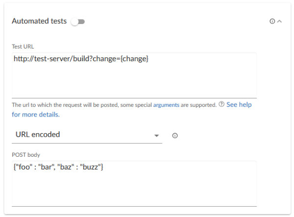 3. Configure your P4 Code Review project to run automated tests with a URL and parameters like this: