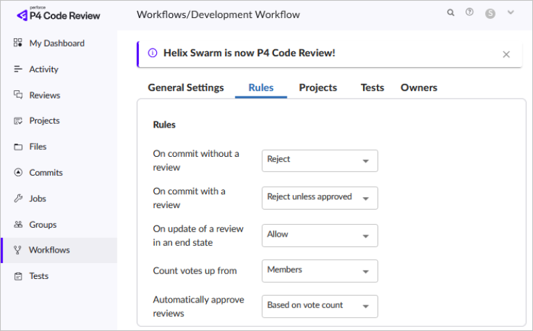Workflow rules define how P4 Code Review handles changelists and reviews at key points in the review process. Each rule controls what happens when a changelist is submitted with or without an associated review, or when a review is updated in certain states. These rules determine the level of control, automation, and enforcement applied to a project or branch.