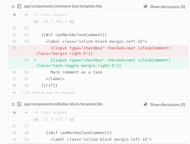 You can use comments as tasks to indicate that some work has to be done before a code review should be merged. For details on this feature, see Tasks.