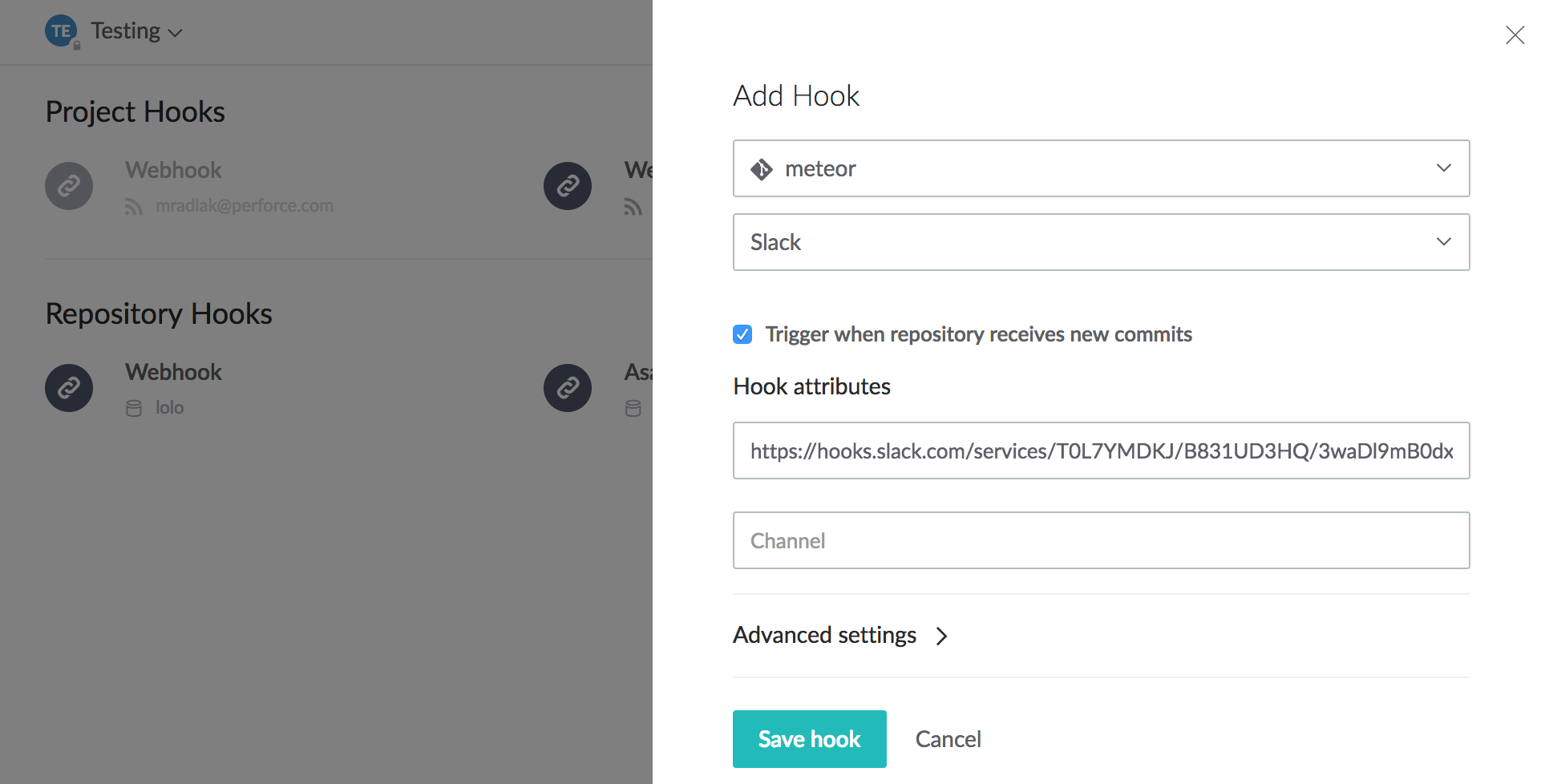 Click Save hook. Details of new commits are now posted to the configured slack channel.