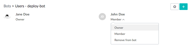 After creating a bot, you can manage its settings (excluding Company admin bot status) from the bot settings form or the Bot > Users view. To access the settings, click the Gear button
