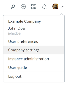 Access the Company Settings view using the user dropdown list in the header or from the My Dashboard tab.
