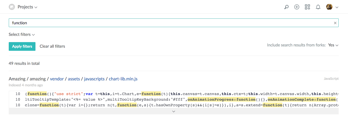 In addition to the project and repository filters, you can define whether to include or omit results from forked repositories using the dropdown list on the right.