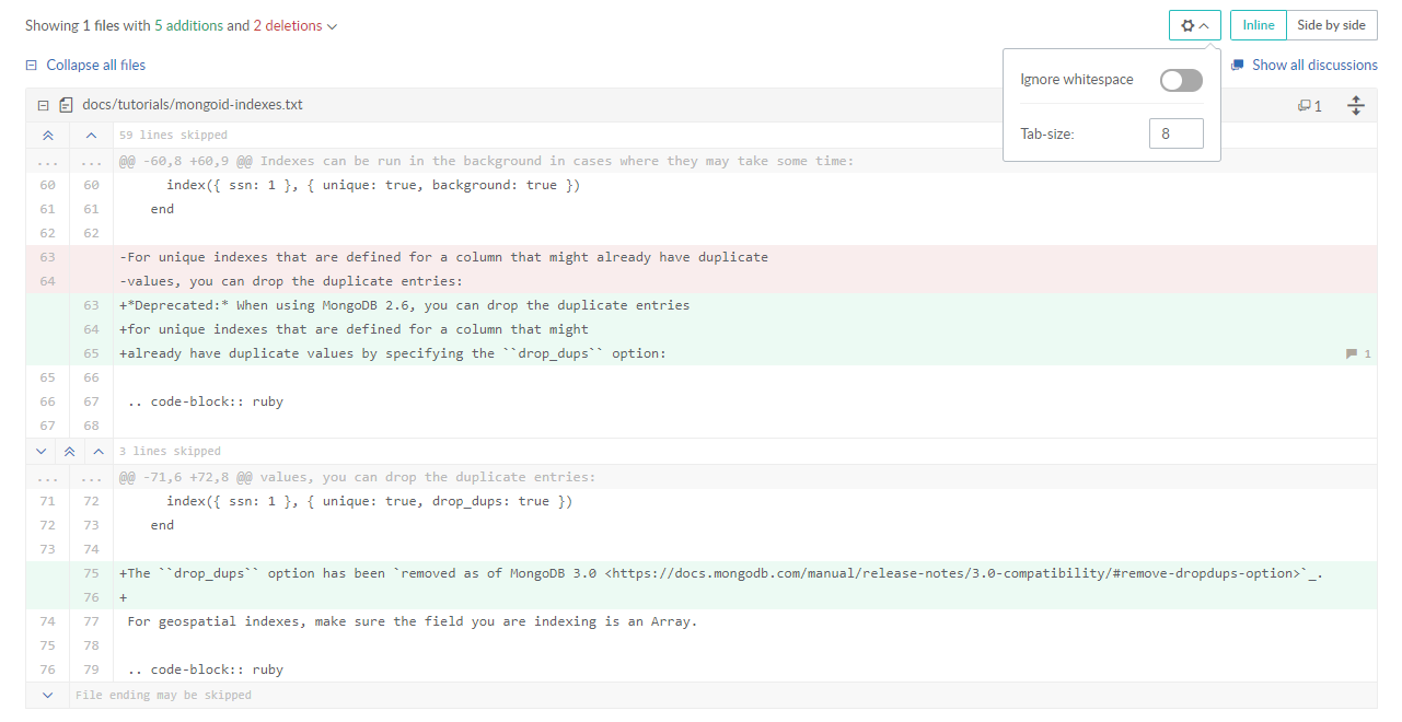 To hide whitespace changes, switch on Ignore whitespace from the Gear button