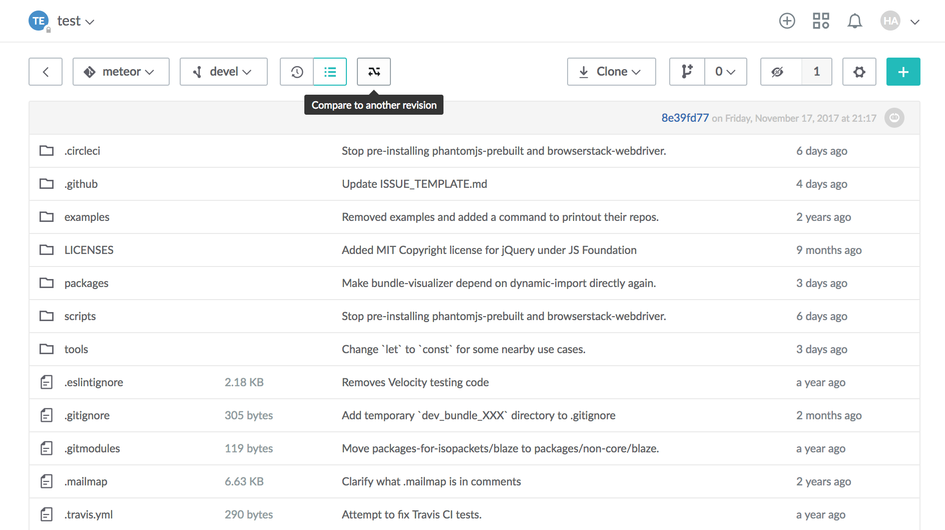 In addition to viewing raw changes between revisions on the Changes tab, you can see commit difference on the Commits tab.