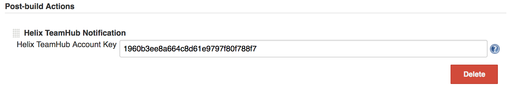 In the Job Configuration, add a new Perforce TeamHub Notification Post-build Action by providing the account key of the TeamHub account you want the job to utilize. This account is usually the bot account you created in Set up a bot account for programmatic access.