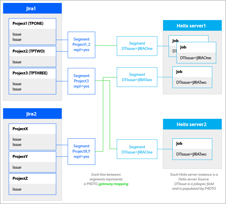 This section describes how multiple Jira defect tracking system server instances can be connected to multiple P4 Server instances with P4 DTG.