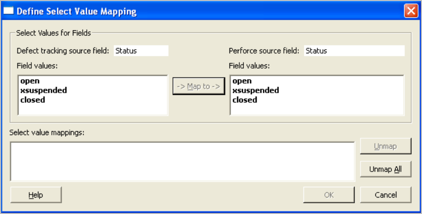 Specify the correspondence between values in P4 Server and those in the defect tracking system by selecting the P4 Servervalue and its corresponding defect tracker value, then clicking Map to.
