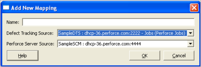 Enter a name for the mapping, and choose the P4 Server source and the defect tracking source that you want to map. Click OK. The Edit Perforce-Defect Tracker Mapping dialog appears.