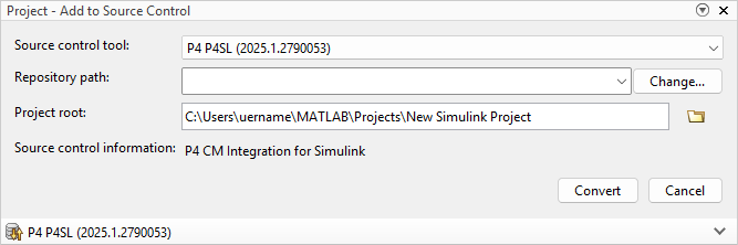- From the Simulink Project tab, click Use Source Control to open the Source Control Information dialog.