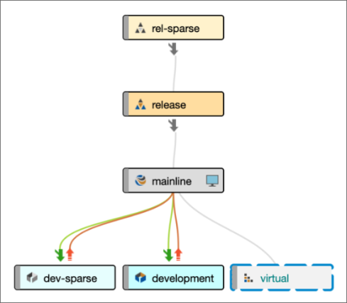 The principle of change propagation is merge down, copy up. The goal is to keep less stable streams up to date with their more stable parent or child, so that when change is propagated from a less stable stream to a more stable one, no work is overwritten. This approach keeps the resolve operation as simple as possible. The merge/copy and resolve features allow you to propagate change between streams.