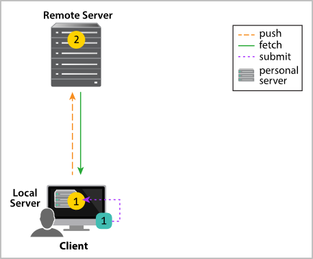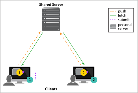 Client 1 interacts with the Server 1 personal server, which in turn interacts with the shared server.