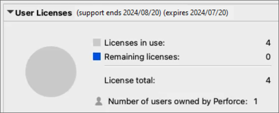 Licenses in use, Remaining licenses, and License total. Perforce P4 Cloud includes the "Number of users owned by Perforce" for Perforce-hosted administrators that are separate from your "Licenses in use".
