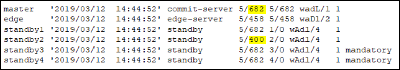 In this example, we have invoked p4 servers -J on master, and we see that standby2 has 400, which does not yet match the 682 value on master: