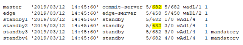 Later, again on master, we invoke p4 servers -J to see that standby2 has progressed to 682, which matches master and indicates that standby2 has a current journalcopy.