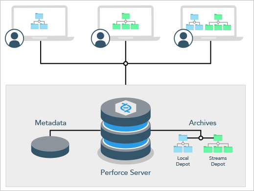 Clients also manage local workspaces (local directories) that contain a subset of the files in the repository. Users can view, check out, and modify these local files and submit changes back to the repository. Versioned files are stored on the server in depots of various types, such as: